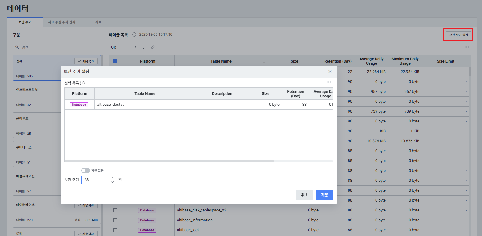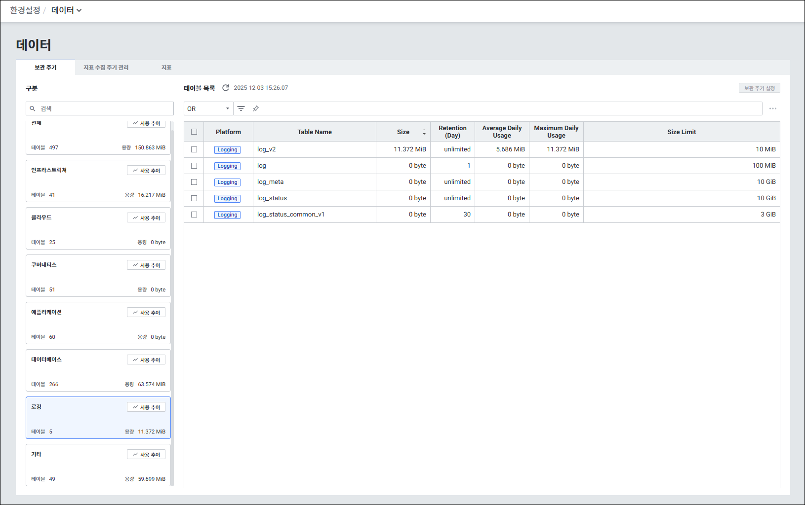 메뉴 경로: 환경설정 > 데이터 > 보관 주기 > 테이블 목록