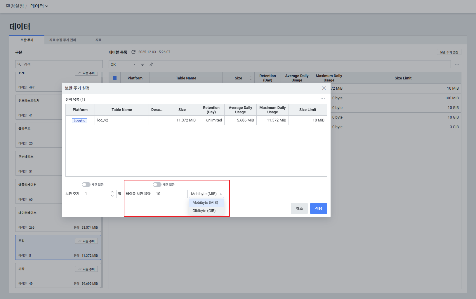 테이블 보관 용량 설정 대상로깅 플랫폼만 설정 가능합니다.