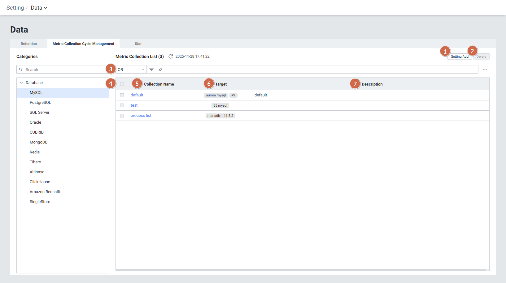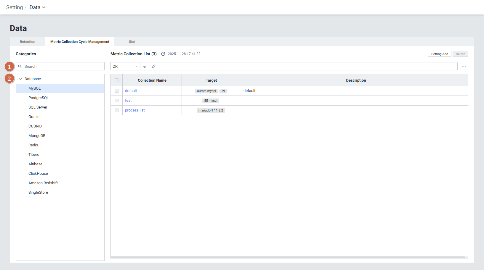 방법 1Setting > Data > Metric Collection Cycle Management에서 데이터베이스 지표 수집 활성화 및 주기 관리 설정
