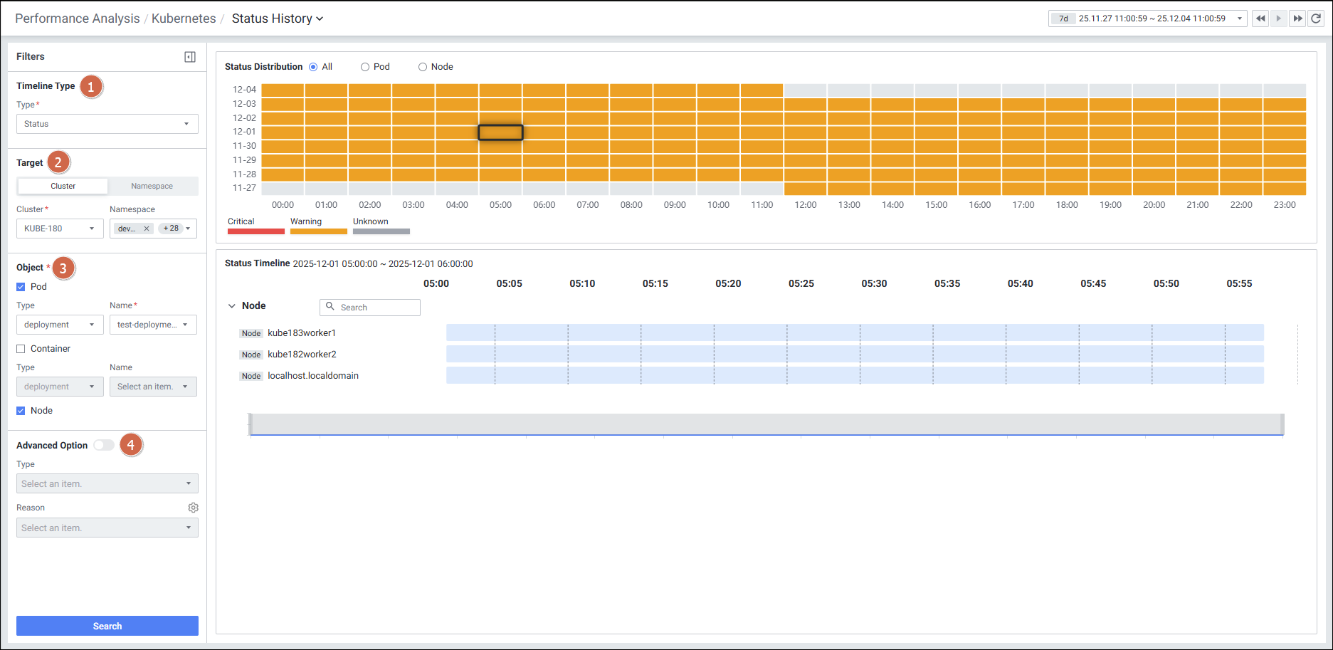| 3 | Object | 타임라인에 표시할 오브젝트를 선택합니다. Pod: Pod 표현 여부 및 필터 기준을 선택합니다. Container: Container 표현 여부 및 필터 기준을 선택합니다. Node: Node 표현 여부를 선택합니다. |