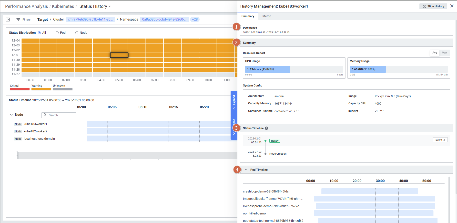 | 1 | Chart | Time period 기준으로 기간에 해당하는 타겟별 상태를 타임라인 형태로 표현합니다. 타임라인 클릭 시 Status Timeline Detail Slide가 노출됩니다. Node 영역과 Pod/Container 영역으로 구분하여 표시합니다. |