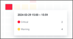 | 1 | Chart | 이벤트 발생을 히트맵 형태로 표현합니다. 해당 대상의 상태에 따라 셀 색상이 다르게 표시됩니다. 특정 셀에 마우스 오버 시 툴팁으로 해당 시점의 Event Count 정보를 확인할 수 있습니다. ![]() |