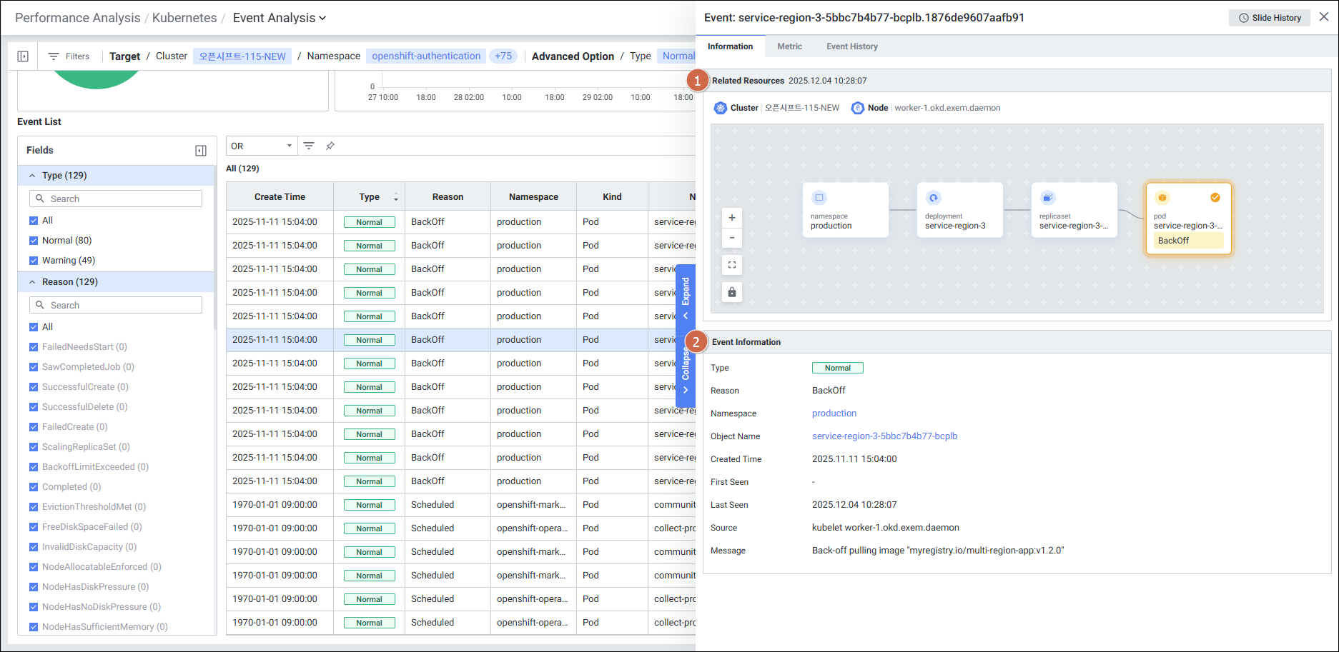 - ⚠️ 주의: Event List Detail Slide의 Related Resources(리소스 관계도)는 파드(Pod) 타입 이벤트인 경우에만 노출됩니다. 다른 Kind의 이벤트에서는 표시되지 않습니다.