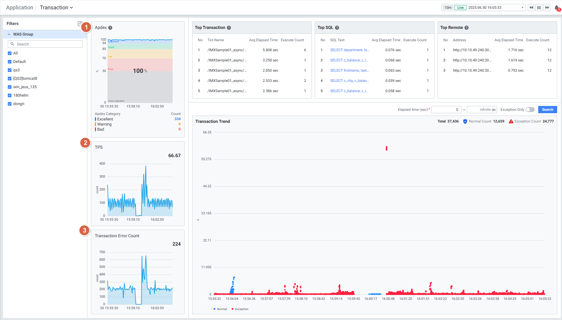 실시간 수집된 트랜잭션 차트와 지표별 데이터(Apdex, TPS, Transaction Error Count 등)를 확인하는 화면입니다.