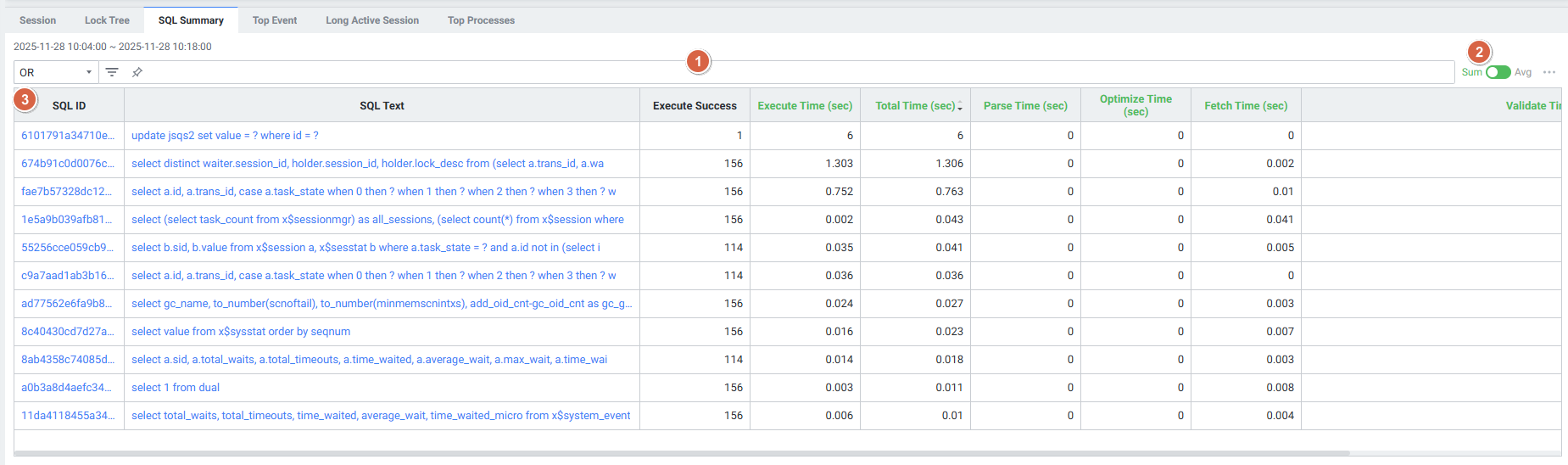 | 1 | Filter | 필터 조건에 따라 SQL Summary 목록을 보여줍니다. Or 또는 And 조건으로 선택 가능합니다. |