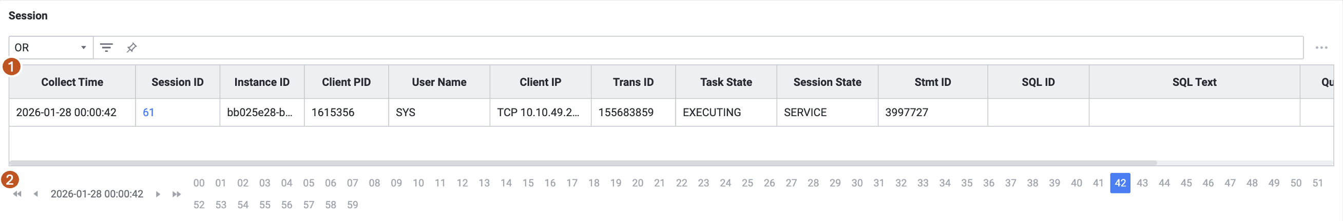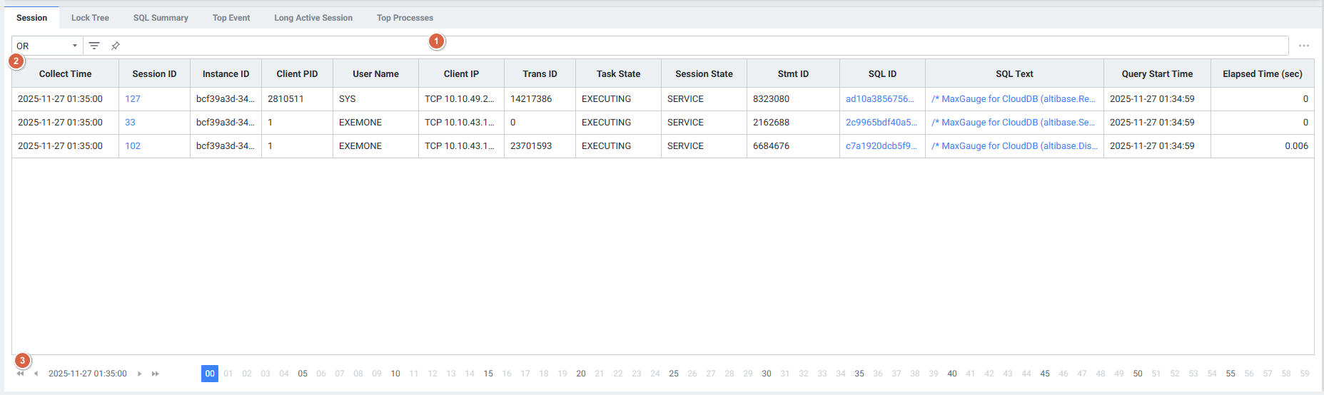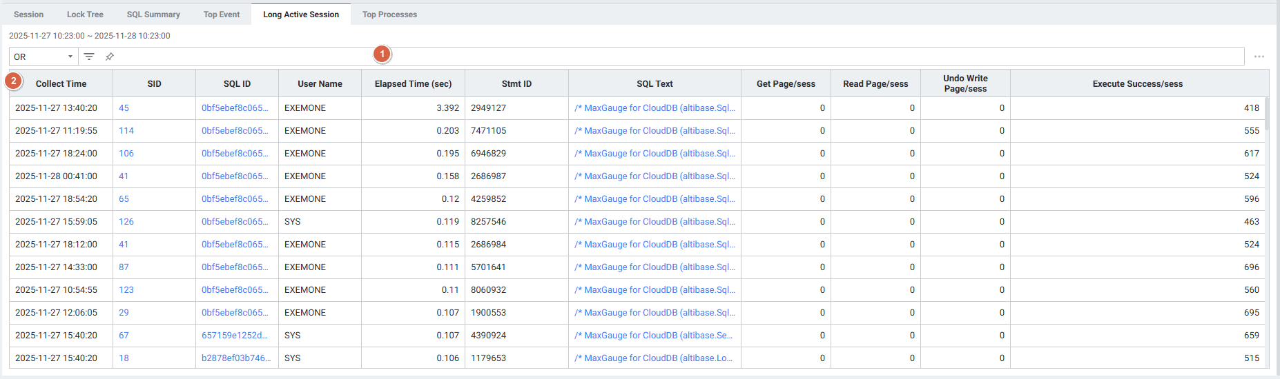 | 1 | Filter | 필터 조건에 따라 Long Active Session 목록을 보여줍니다. Or 또는 And 조건으로 선택 가능합니다. |