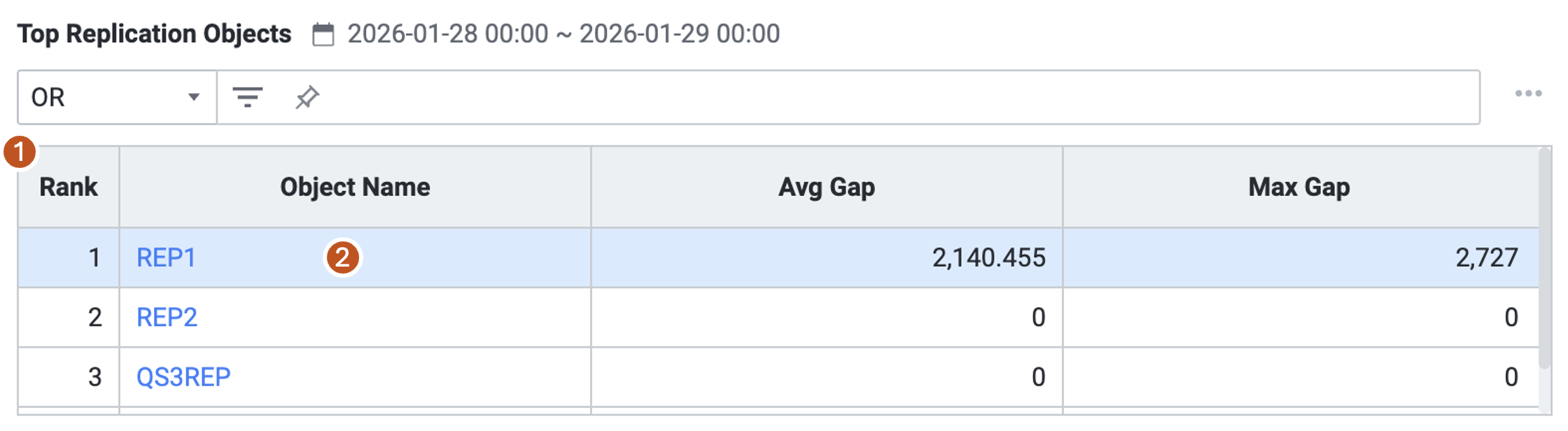 | 3 | Top Replication Objects Grid | Avg Gap 값이 큰 순서대로 나열한 상위 10개의 Replication Object에 대한 Avg Gap, Max Gap 값을 보여줍니다. |