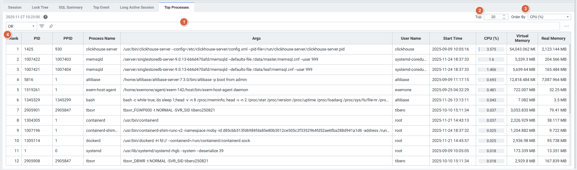| 3 | Order By | Order By 기준을 설정합니다. (CPU (%) / Virtual Memory / Real Memory) |