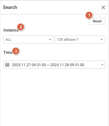 | 2 | Filter Label | 검색 패널에서 선택한 조건(Instance Name, Time)이 상단에 텍스트로 표시됩니다. |