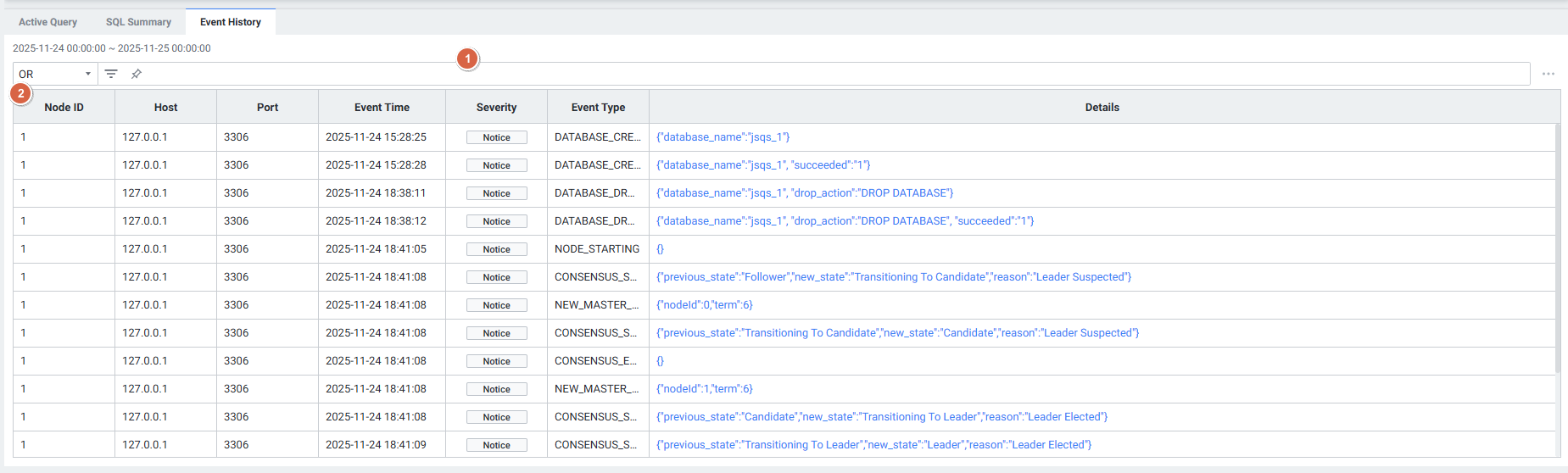 | 1 | Filter | 필터 조건 따라 Event History 목록을 보여줍니다. Or이나 And 조건으로 선택 가능합니다. |