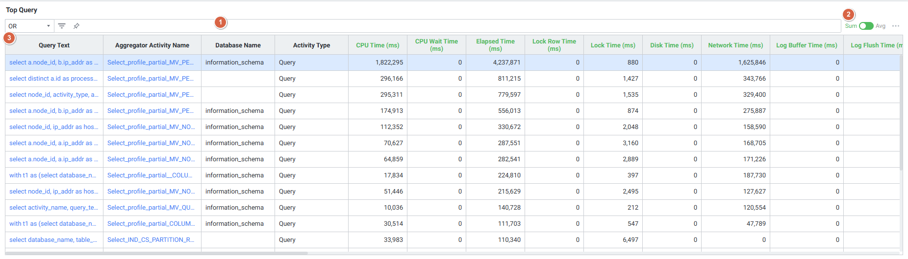 | 1 | Filter | 필터 조건 따라 Top Query 목록을 보여줍니다. Or이나 And 조건으로 선택 가능합니다. |