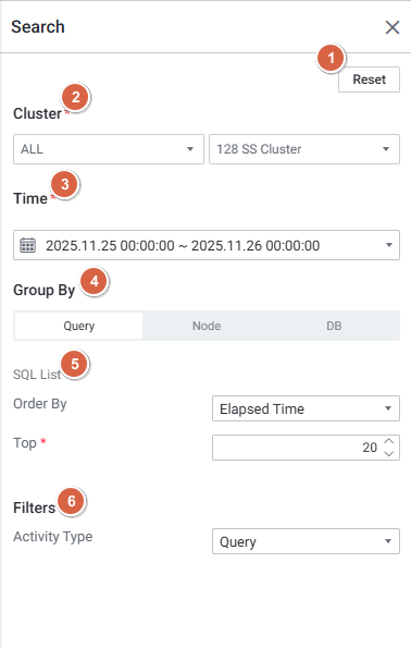 | 6 | Filter | Top SQL의 Activity Type으로 Filter 값을 설정니다. |