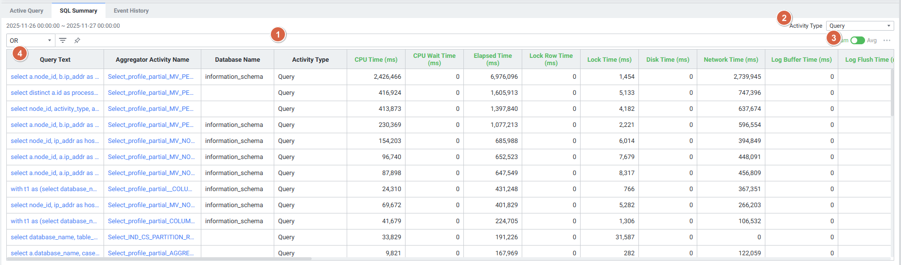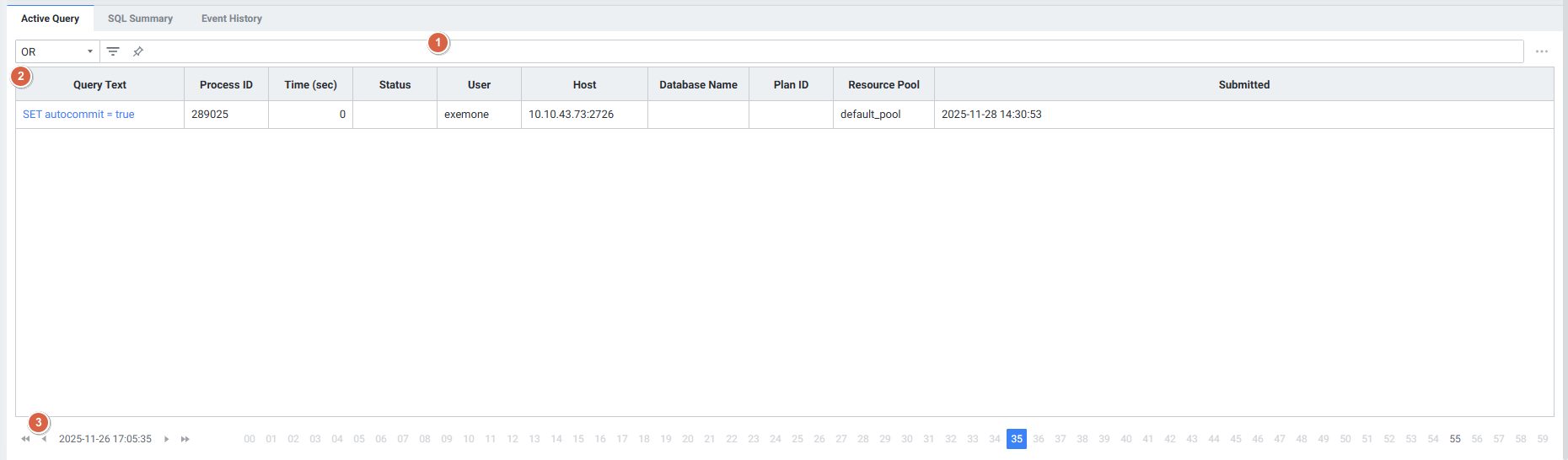 | 1 | Filter | 필터 조건 따라 Active Query 목록을 보여줍니다. Or이나 And 조건으로 선택 가능합니다. |