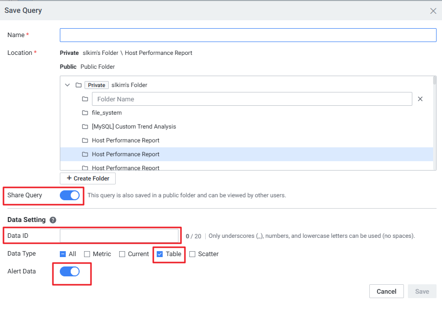대시보드 위젯 또는 알람에서 쿼리 매니저를 사용하려면 저장 시 [Share Query] 옵션을 활성화하여 Data Setting을 지정해야 합니다.