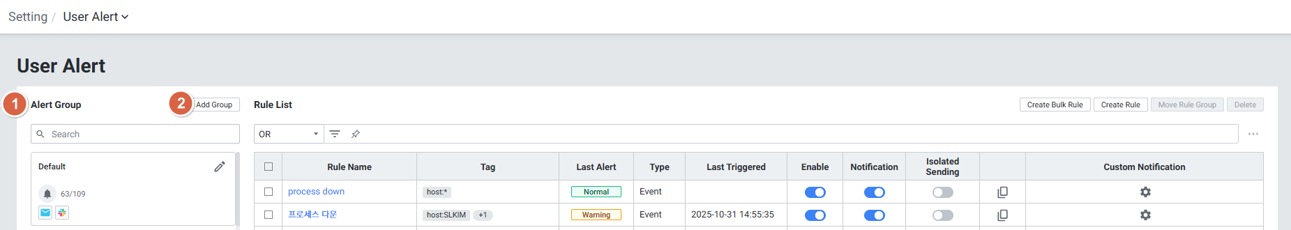 설정 위치: Settings > Alert > User Alert > Create Rule