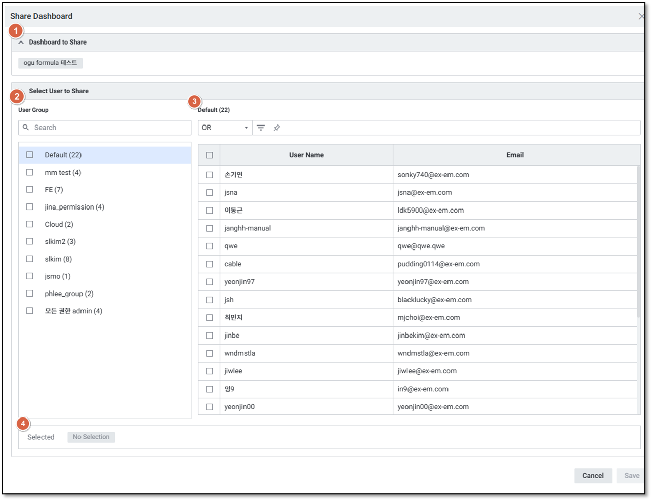 | 4 | Selected | 대시보드를 공유할 사용자 리스트입니다. '사용자 그룹 | 사용자 명' 형태로 제공됩니다. |