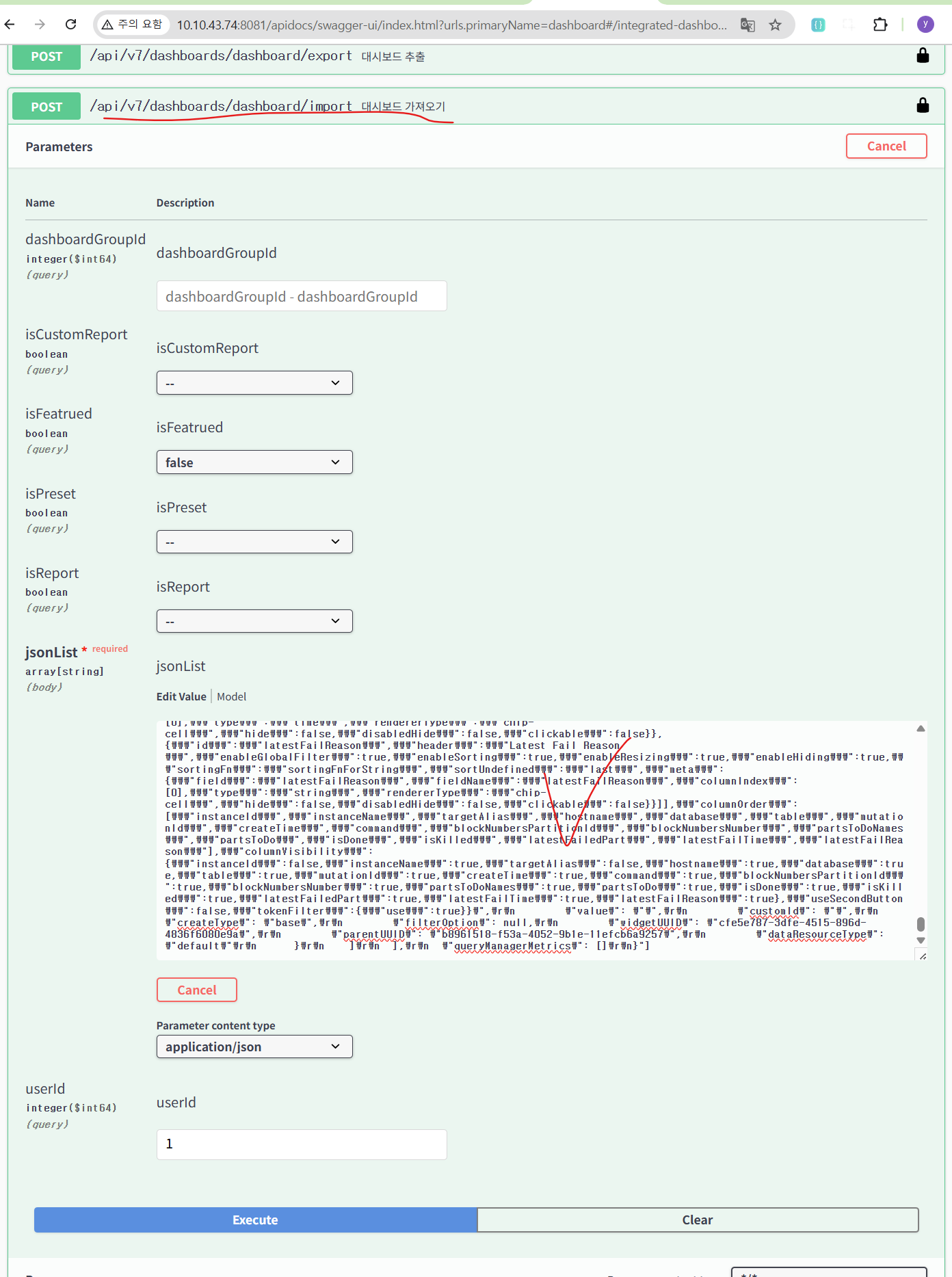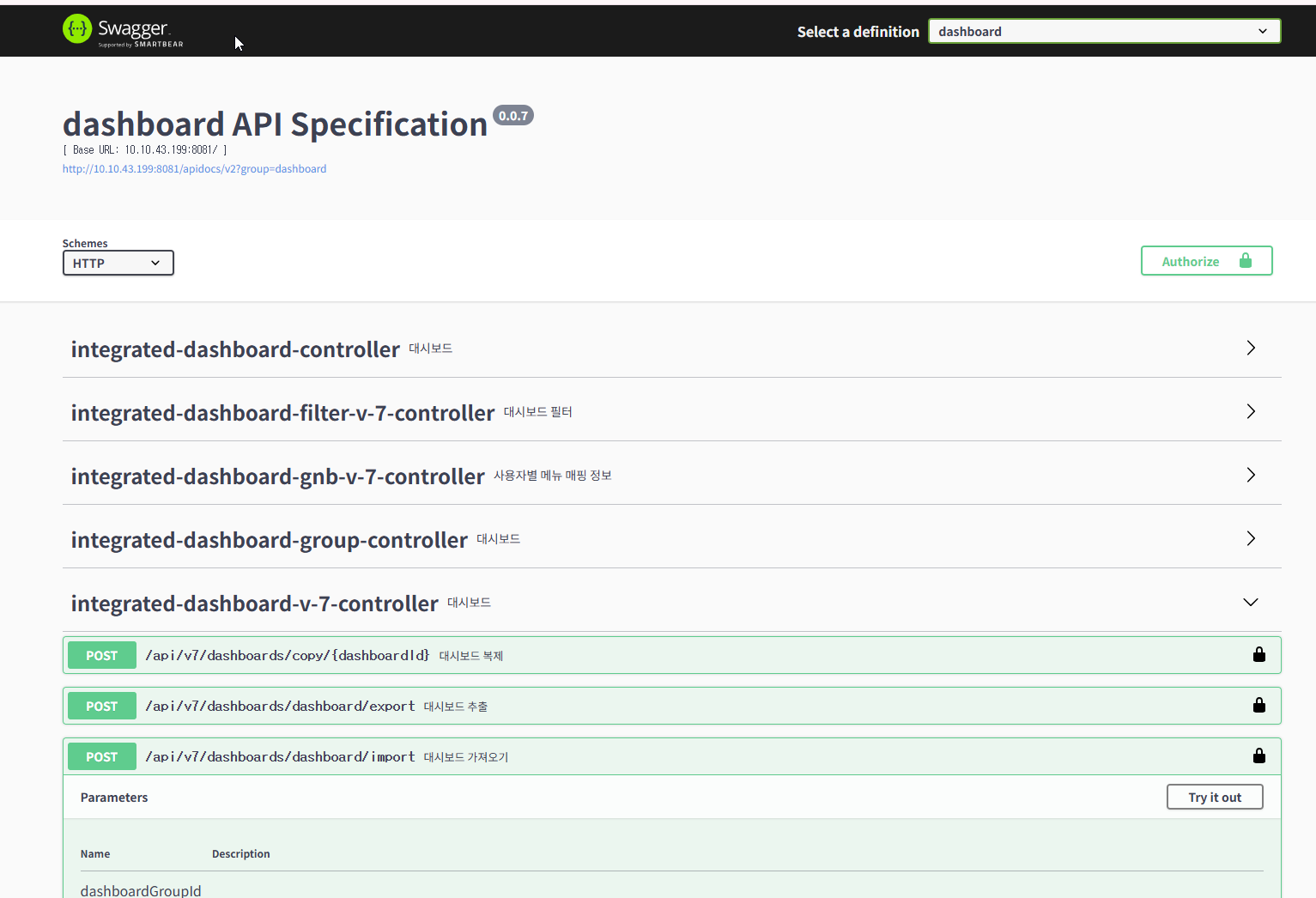화면에서 대시보드 import가 불가능한 경우 Swagger를 통해 import할 수 있습니다.