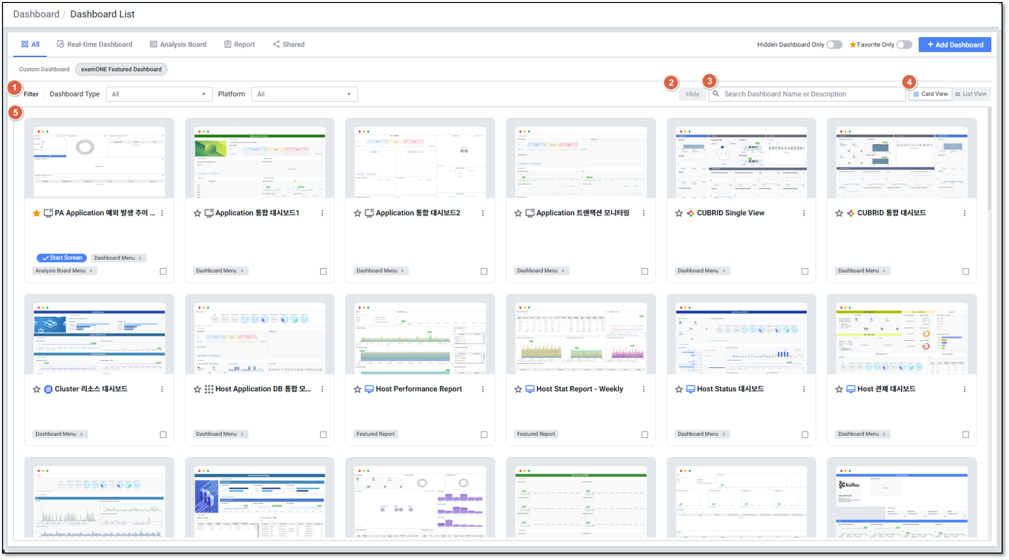 | 4 | Change View | 목록 뷰 / 카드 뷰를 제공합니다. 목록 뷰 선택 시 우측에 대시보드 미리보기가 제공됩니다. |