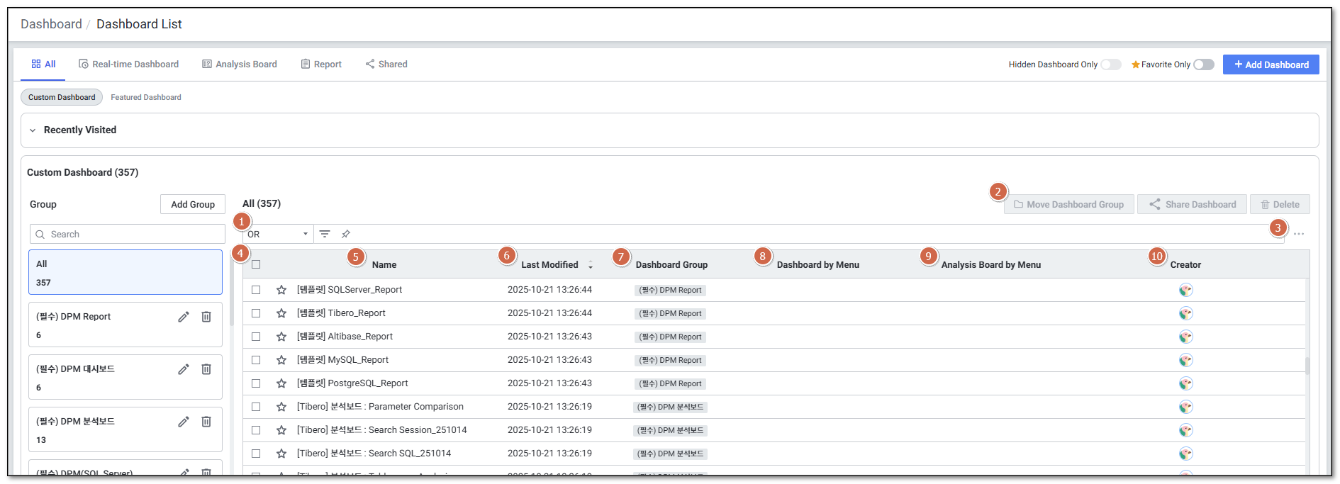 | 2 | Move/Share/Delete Dashboard | 대시보드 선택 시 활성화됩니다. Move Dashboard Group: 대시보드를 이동할 그룹으로 이동 / Share Dashboard: 사용자에게 공유 / Delete: 삭제 |
