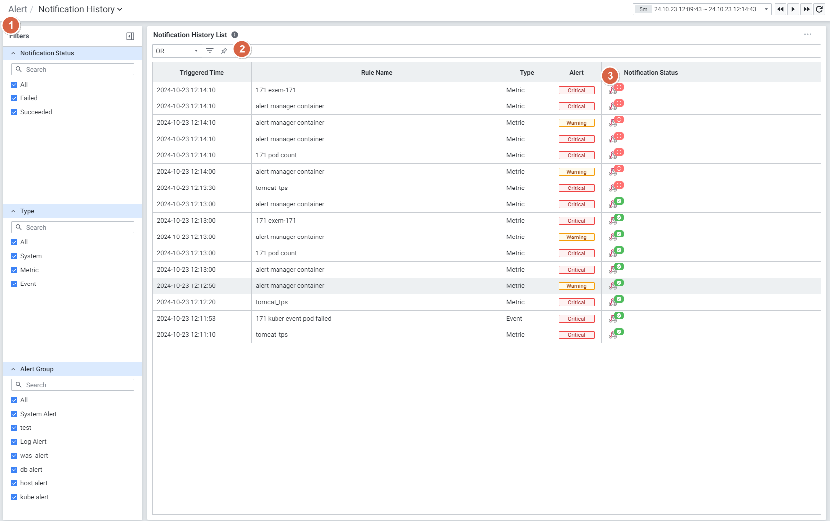 1FilterNotification History 목록을 Status, Type, Alert Group 기준으로 조회가 가능합니다.