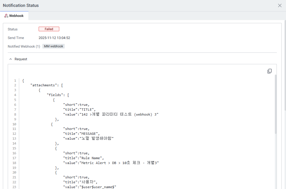 (웹훅 전송 실패 시: , 웹훅 전송 성공 시: )