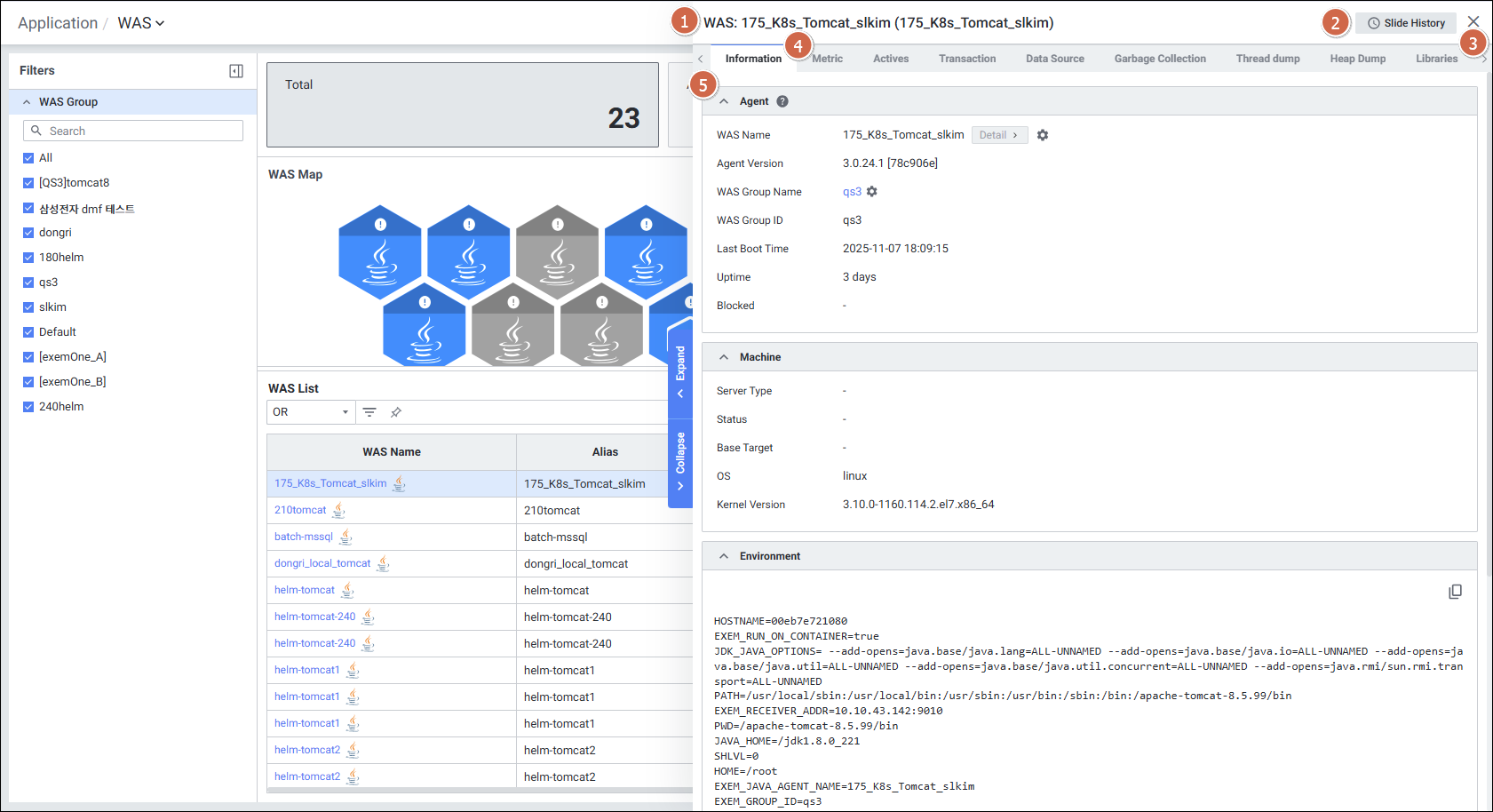 | 4 | Tab | 탭 클릭 시 해당 탭의 디테일 슬라이드 화면을 보여줍니다. Information Metric Actives Transcation Data Source Garbage Collection Thread dump Heap Dump Libraries Loaded Class List Config Alert 클릭 시 방향을 이동하여 탭 목록을 보여줍니다. |