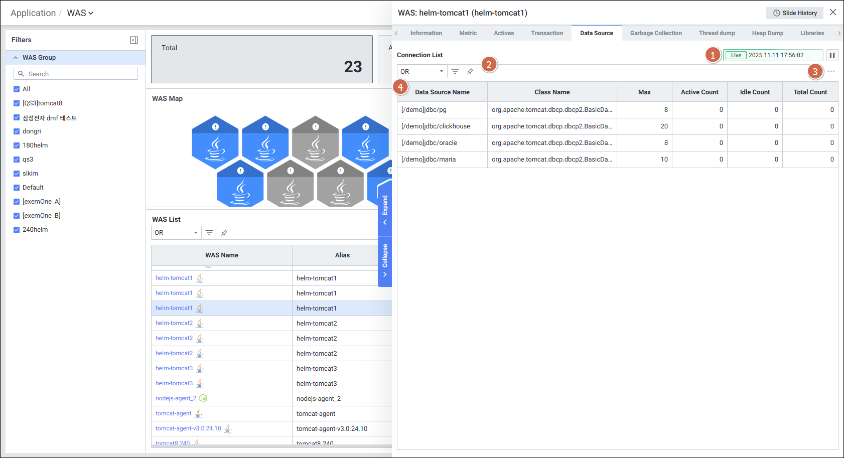 WAS 디테일 슬라이드의 데이터 소스를 확인하는 화면입니다.
