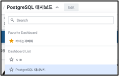 | 1 | Dashboard Name | 대시보드 이름입니다. 이름을 선택하면 대시보드 목록을 보여줍니다. ![]() Search: 대시보드 이름을 검색합니다. Favorite 설정 / 해제(★/☆): 즐겨찾기 대시보드 설정 / 해제 합니다. Favorite Dashboard: 즐겨찾기 설정된 대시보드 목록을 보여줍니다. Dashboard List: 즐겨찾기 되지 않은 대시보드 목록을 보여줍니다. |