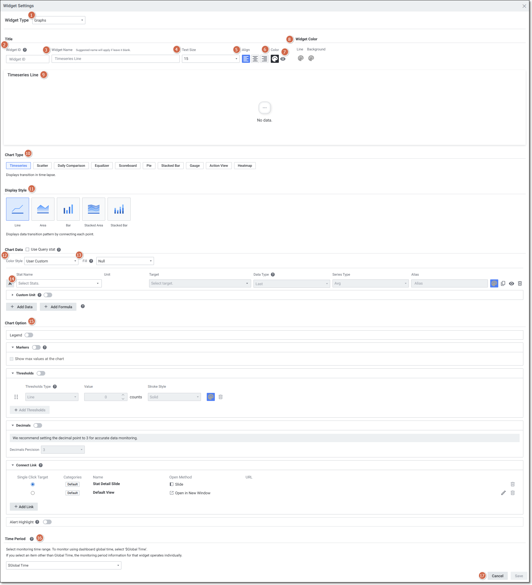 | 14 | Chart Data | 데이터를 설정합니다. (최대 26개까지 데이터 설정 가능) Use custom stat: 사용자가 만든 지표를 사용할 수 있습니다. Stat Name: 14. 지표 설정 팝업창이 열립니다. Target: 15. 타겟 설정 팝업창이 열립니다. Data Type: 데이터 타입을 선택합니다. Series Type: Target의 데이터 연산을 선택합니다. Avg: 선택한 모니터링 Target 데이터의 평균 값입니다. Max: 선택한 모니터링 Target 데이터의 최댓값입니다. Sum: 선택한 모니터링 Target 데이터의 합계 값입니다. By: 모니터링 Target의 데이터 값을 연산하지 않고, 모니터링 대상 별 현재 값을 보여줍니다. (Daily Comparison, Scoreboard-Style 2위젯은 미지원) Alias: 지표 이름을 사용자가 설정합니다. Custom Unit: 데이터 항목별로 원하는 단위를 직접 설정할 수 있습니다. |