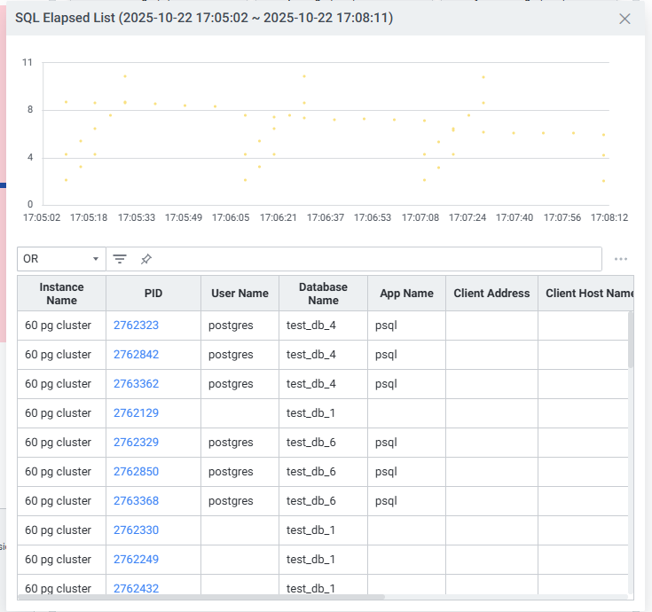 SQL의 수행시간을 Scatter 차트로 확인할 수 있습니다. 등록된 인스턴스들의 Slow Query를 확인하거나 특정 인스턴스를 선택해서 확인할 수 있습니다.