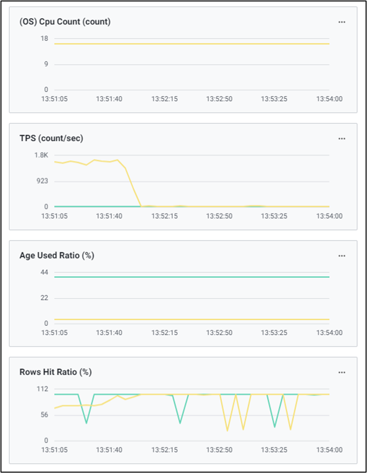 데이터베이스의 활동성 및 지연에 관한 지표들을 이용하여 Chart 형식의 모니터링 화면을 제공합니다. 기본적으로 4개의 주요 성능 지표에 대한 모니터링이 가능하며, 시스템 및 업무 특성에 따라 원하는 성능지표로 변경 및 확장이 가능합니다.