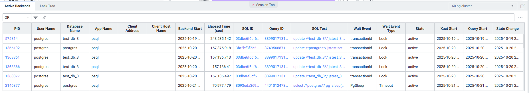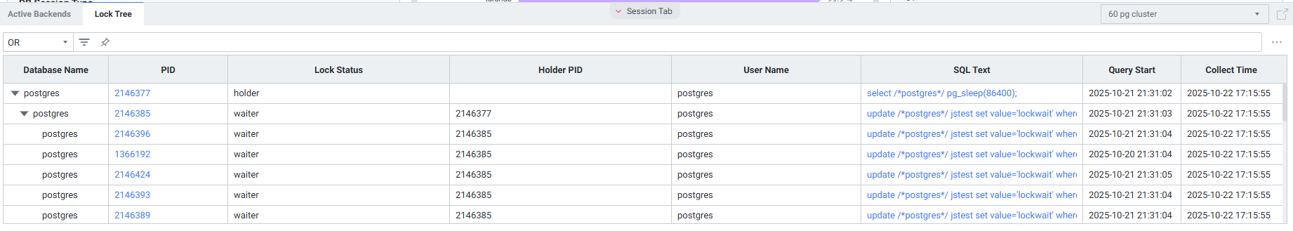 현재 Lock 상태의 Backends 목록을 확인할 수 있습니다. 멀티 데이터베이스 모니터링을 지원하며 우측 상단에서 원하는 인스턴스만 모니터링이 가능하도록 선택할 수 있습니다.