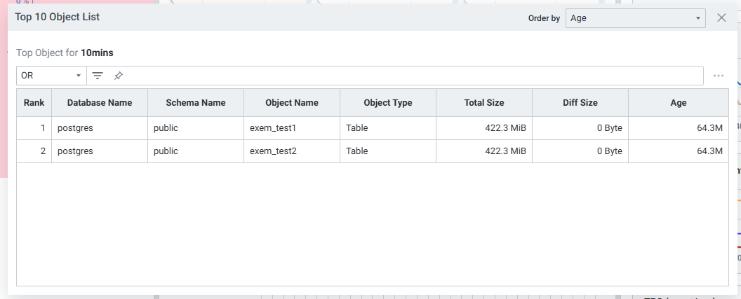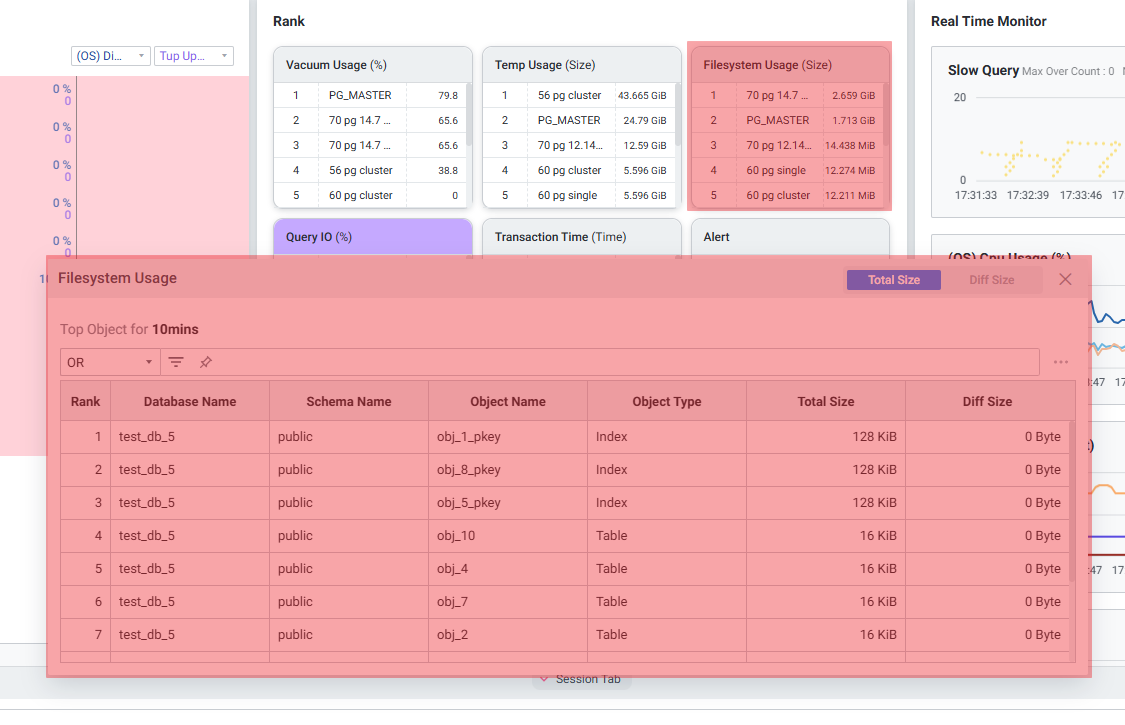 | 8 | Age | 10분 동안의 Age 변화량 Order By 선택 지표 값에 따라 그리드에 표현되는 데이터 달라집니다. 정렬 기준: Scan Count, Scan Ratio, Age, Dead Tuple, Analyze Time |