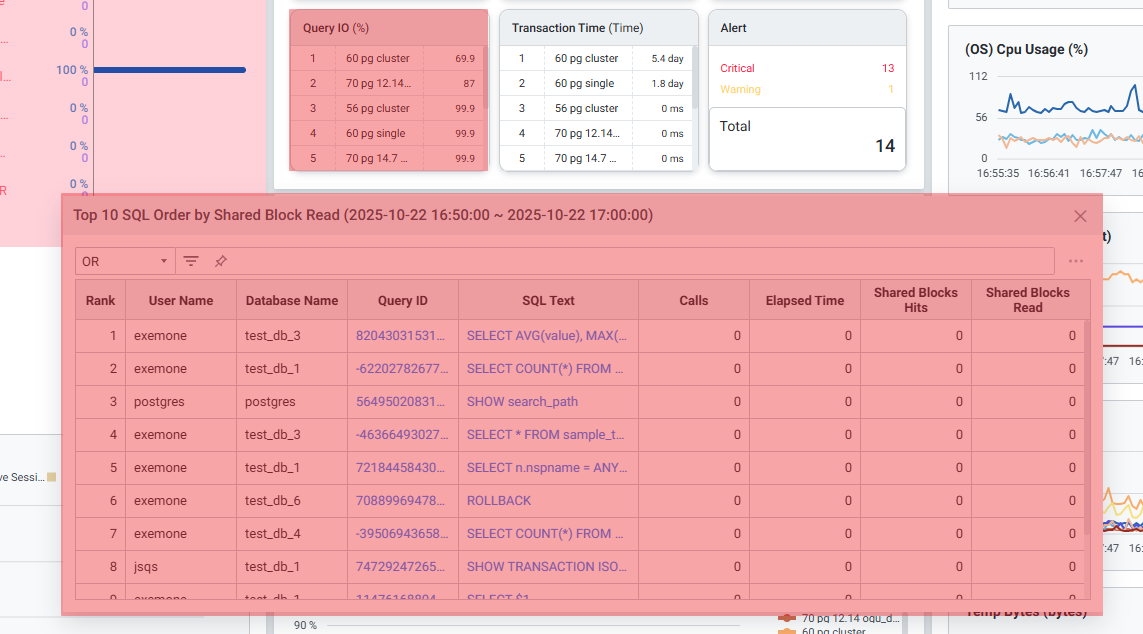 Shared Buffer의 데이터를 쓰는 비율을 보여줍니다. 인스턴스 클릭 시 Shared Block Read 사용이 높은 SQL을 확인할 수 있는 ‘Top 10 SQL Order by Shared Block Read’ 팝업창으로 연계됩니다.