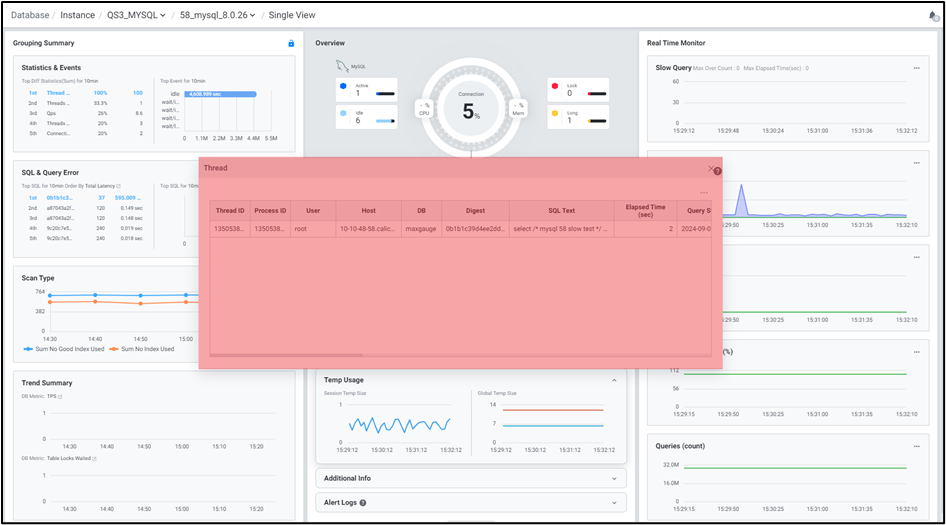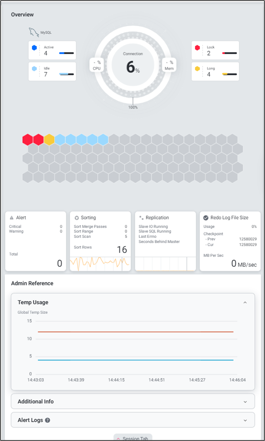 데이터베이스의 전체 Connection에 대한 사용 패턴과 각 사용 상태에 대한 Thread정보, CPU, Memory 사용률을제공 합니다.