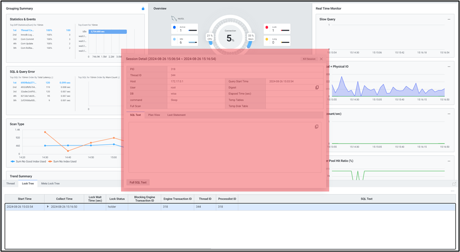 특정 Thread 또는 Lock Tree를 더블 클릭하면 Session Detail 팝업창이 나타나며 세부 정보와 실행중인 SQL 정보를 확인할 수 있습니다. 버튼을 통해 현재 실행중인 Session을 종료할 수 있습니다.
