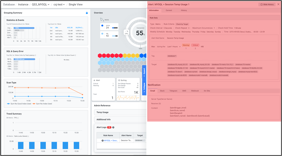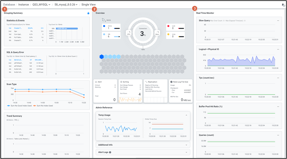 | 1 | Grouping Summary | 데이터베이스 지표, Event통계, SQL 실행 정보, Object scan type별 집계 등 다양한 관점의 집계된 데이터를 통해 장애 원인을 추적할 수 있습니다. |