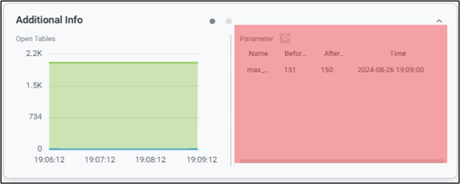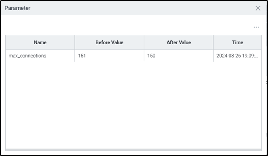 확장 버튼 클릭 시 ‘Parameter’ 팝업창으로 나타납니다. 변경된 파라미터의 변경 전, 변경 후, 변경된 정보를 수집한 시간 값을 확인할 수 있습니다.