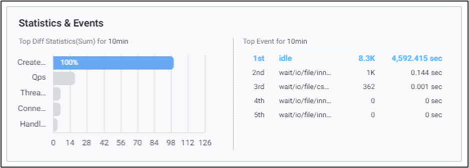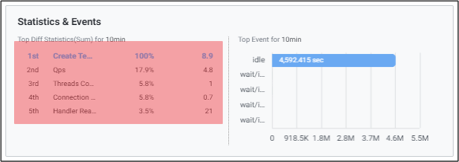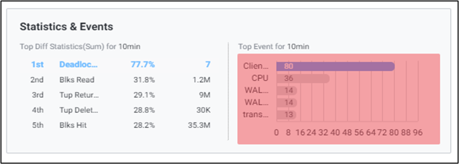 Overview나 Trend 항목에서 비정상적인 상황을 인지했을 때, Statistics & Events 항목에서 최근 급증한 데이터베이스 지표를 확인하여 원인을 추적할 수 있습니다.