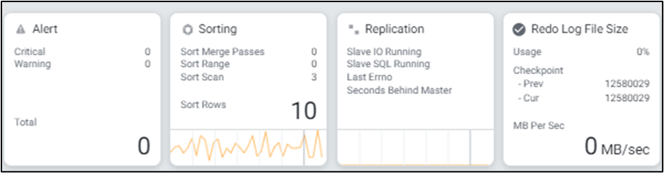 Alert, Sorting, Replication, Redo Log File Size 등 4가지의 인프라 관련 주요 관리 포인트를 표시합니다.