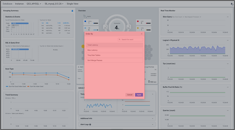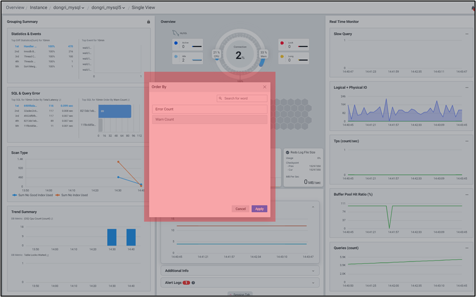 | 2 | Sorting | Sort Merge Passes 발생여부를 확인하여 IO 성능에 문제가 있는지 확인할 수 있습니다. Sort를 많이 사용하는 SQL을 ‘Top 10 Sorting List’ 팝업창을 통해 확인할 수 있습니다. Sort Merge Passes: Sort buffer 크기보다 정렬 데이터가 큰 경우 Temp 영역을 사용해 여러 조각으로 나누어서 처리한 수 Sort Range: Index Scan을 통해 수행되는 Sort 횟수 Sort Scan: Table Scan을 통해 수행되는 Sort 횟수 Sort Rows: Sort되는 Rows의 개수 |