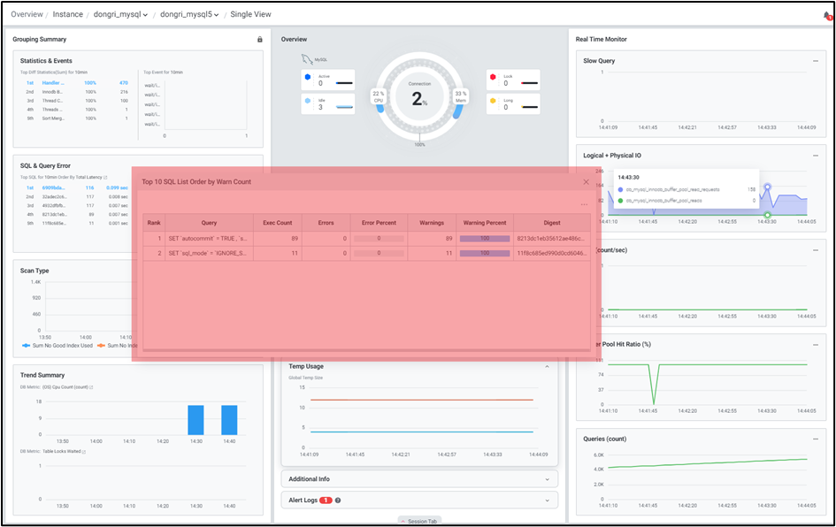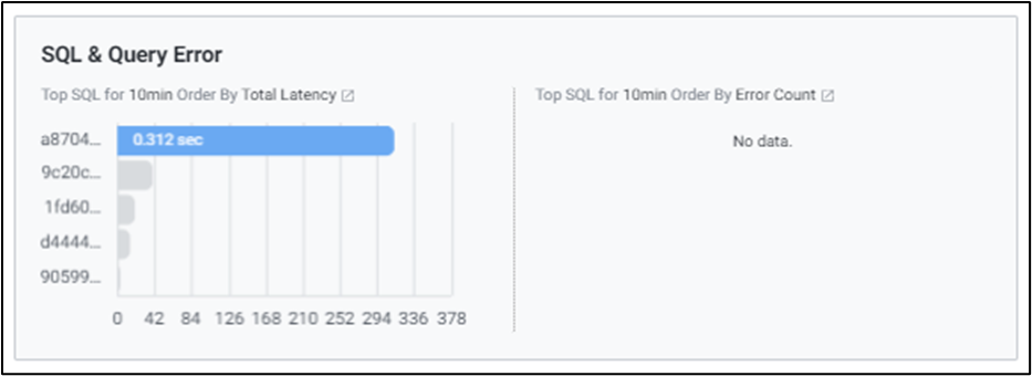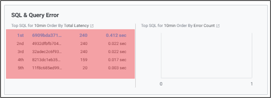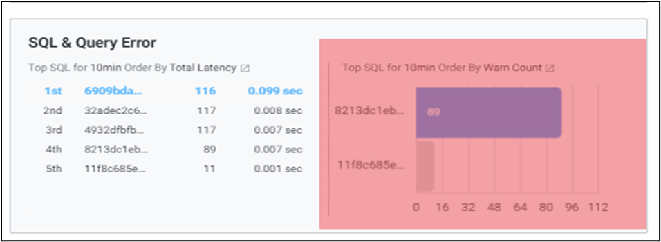 최근 10분 데이터를 비교하여, 기본 event 대기시간의 변화량과 오류 또는 경고 횟수를 기준으로 TOP SQL을 확인할 수 있습니다.
