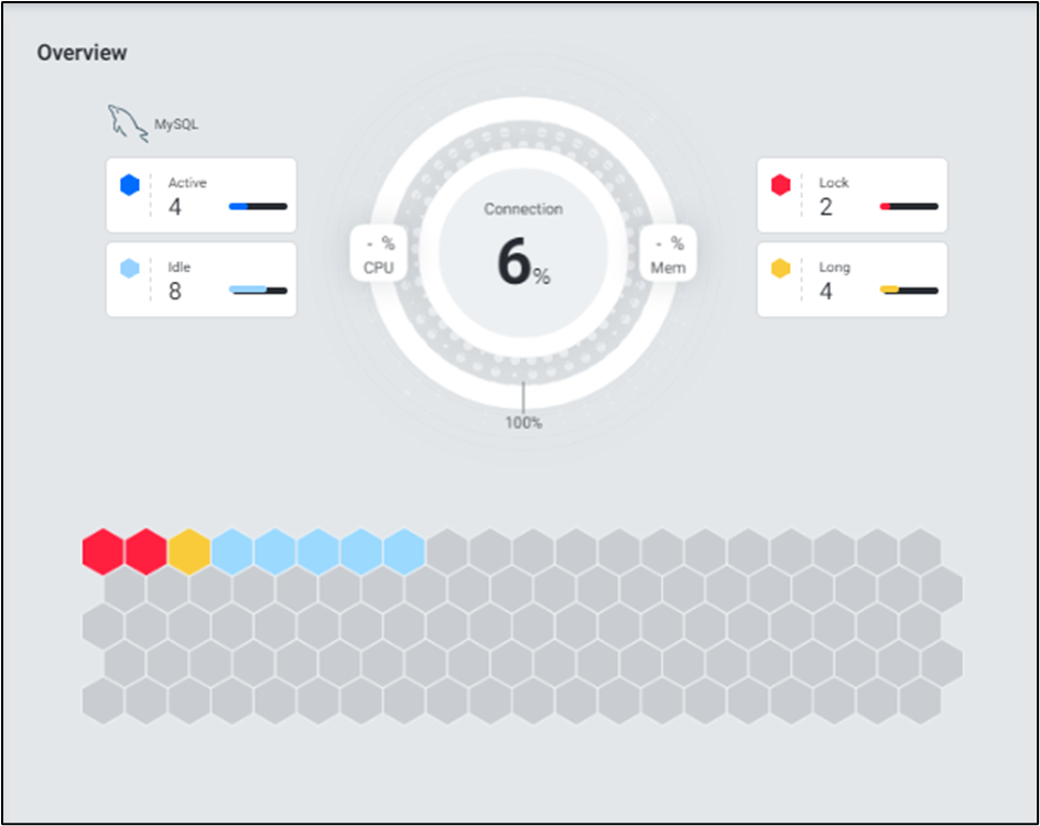 Connection View를 통해 데이터베이스의 전체 Thread가 어떻게 사용되고 있는지 한눈에 파악할 수 있습니다. 사용 비율을 표현한 벌집 뷰에서 각 Thread 상태에 맞는 색 변화를 통해 데이터베이스의 상태를 파악할 수 있습니다.