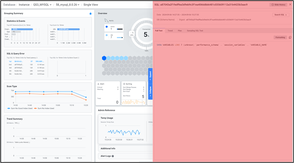 performance_schema 설정이 필요합니다. Top SQL 정렬 기준: Total Latency, Max Latency, Tmp Disk Tables, Sort Merge Passes