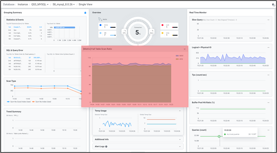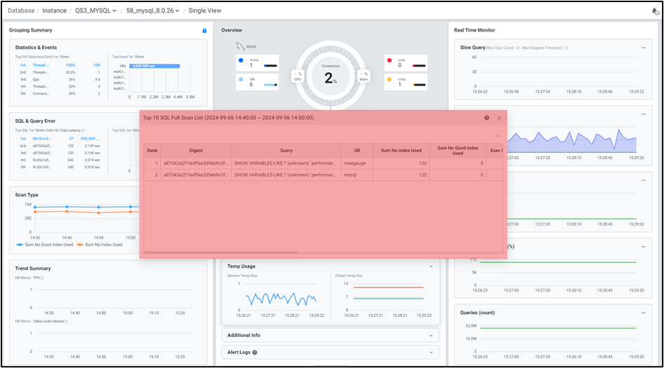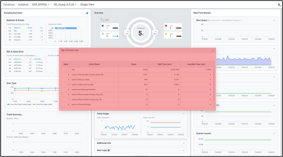 데이터베이스 지표, Event통계, SQL 실행 정보, Object scan type별 집계 등 다양한 관점의 집계된 데이터를 통해 장애 원인을 추적할 수 있습니다.