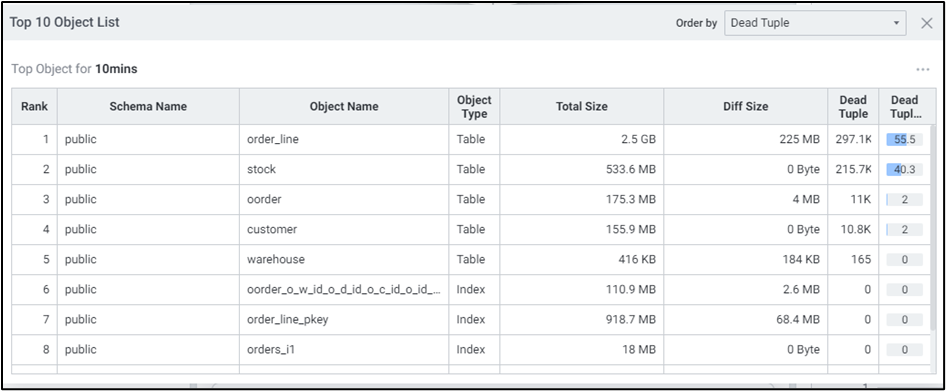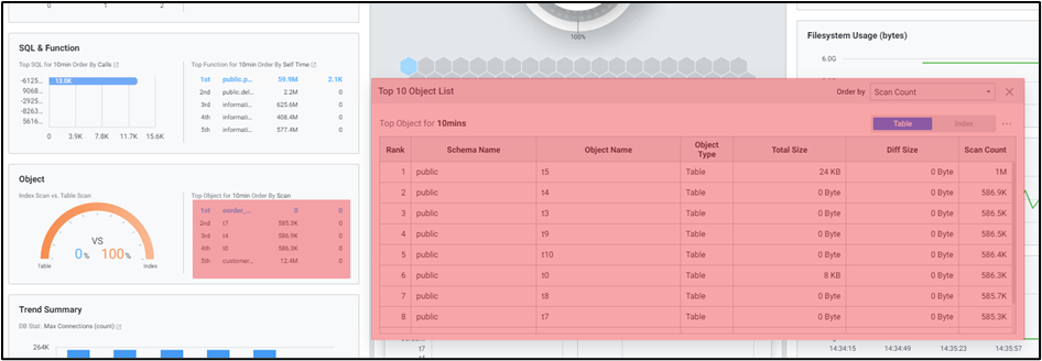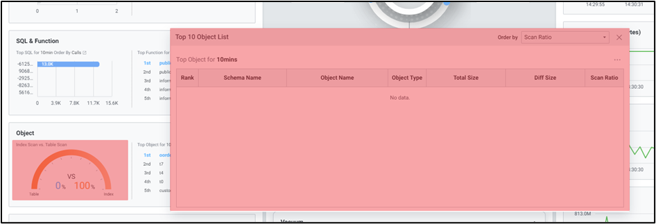 해당 영역을 클릭하면 Dead Tuple 수가 높은 Object를 확인할 수 있는 ‘Top Object List’ 팝업창으로 연계됩니다.