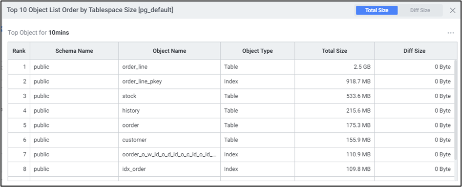 해당 영역을 클릭하면 ‘Top 10 Object List Order by Tablespace Size’ 팝업으로 연계됩니다. 지난 10분간 수집한 Total Size or Diff Size가 큰 Object Top 10을 보여줍니다.