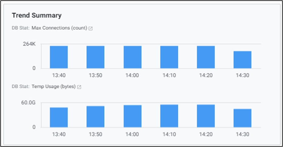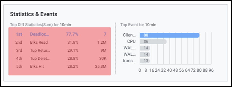 Overview나 Trend 항목에서 비정상적인 상황을 인지했을 때, Statistics & Events 항목에서 최근 급증한 데이터베이스 지표를 확인하여 원인을 추적할 수 있습니다.