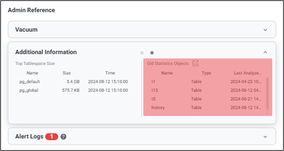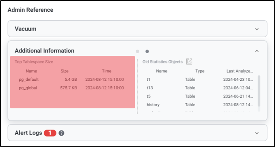 | 2 | Vacuum | Age 상태 정보를표시합니다. Age 사용 비율을 통해 Vacuum 수행 여부를 판단할 수 있습니다. 해당 영역을 클릭하면 Age 사용이 높은 Object를 확인할 수 있는 ‘Top 10 Object List’ 팝업창으로 연계됩니다. |