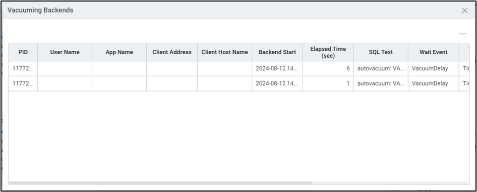 해당 영역을 클릭하면 Vacuum을 오래 수행하고 있는 Active Backend 정보를 확인할 수 있는 ‘Vacuuming Backends’ 팝업창으로 연계됩니다.